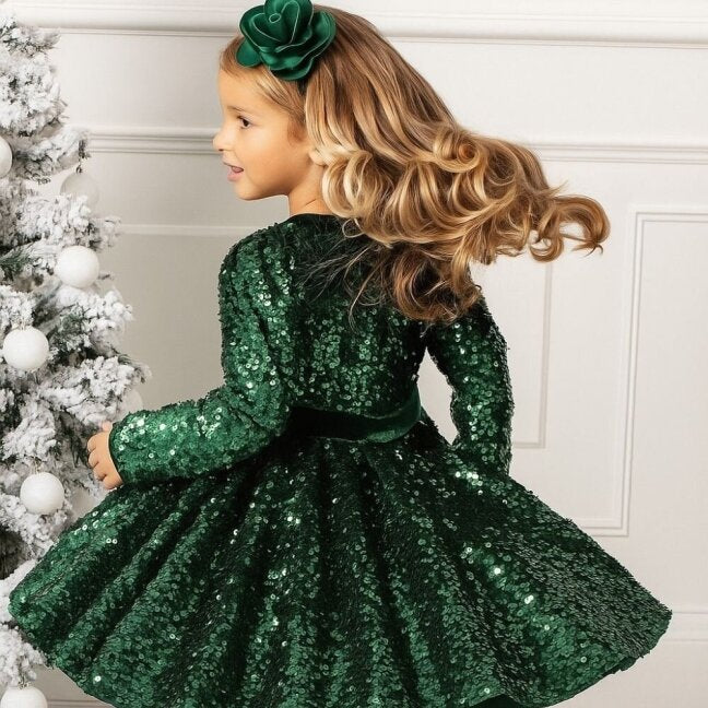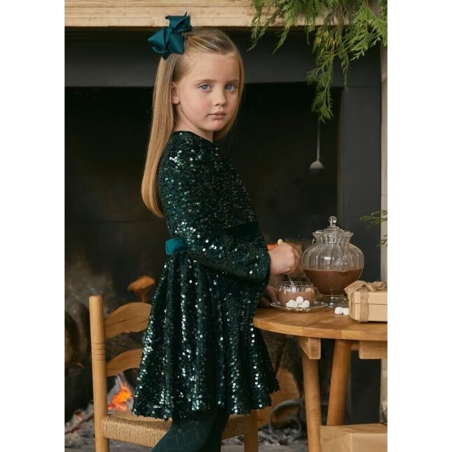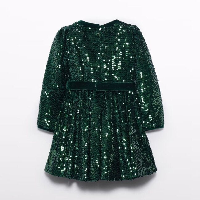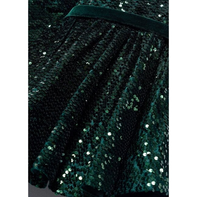 Puikiai tinkanti šventėms, smaragdo žalios spalvos suknelė su žvyneliais . Žvilgantys žvyyneliai sukuria žavią tekstūrą, o ilgos rankovės ir elegantiška juosmens juosta suteikia rafinuotumo. Suknelė turi minkštą pamušalą. Idealiai tinka ypatingoms akimirkoms.