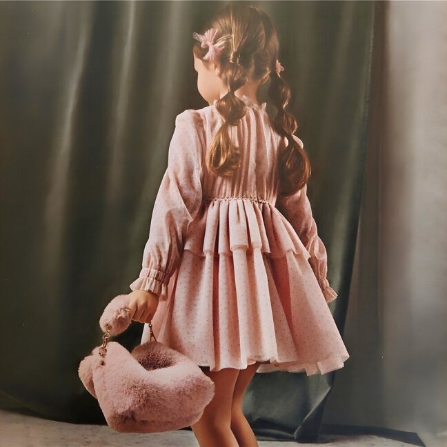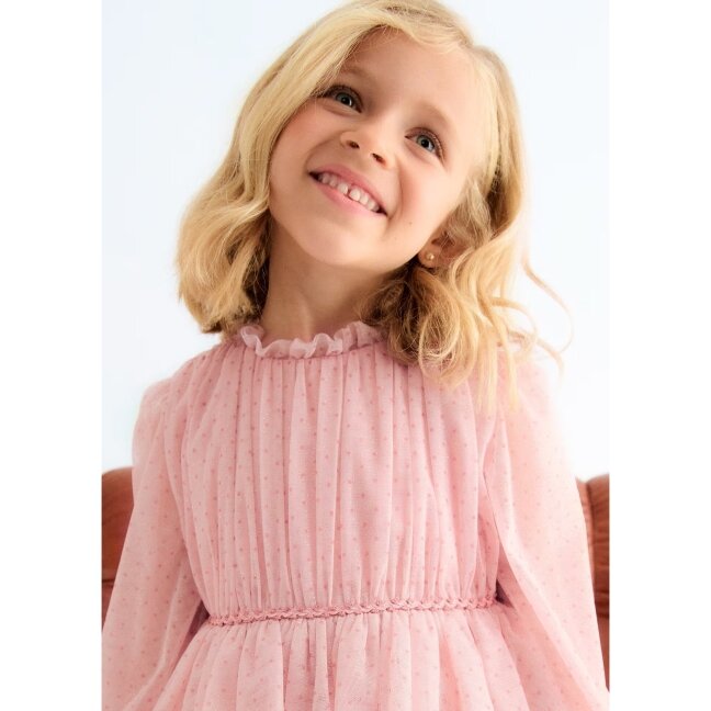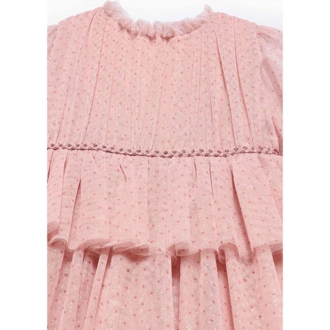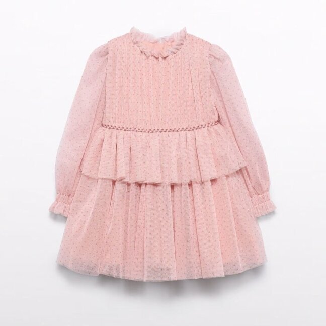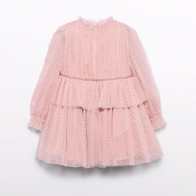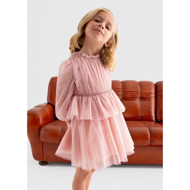 Gražaus dizaino suknelė ilgomis rankovėmis. Sijono dalis rauktas kelių sluoksnių tiuliu, kuris suteikia daugiau apimties. Puošnumo suteikia paraukta apykaklė. Paraukti rankogaliai. Nugaroje užsegama paslėptu užtrauktuku. Viso ilgio natūralios medvilnės pamušalas suteikia daugiau pūstumo.