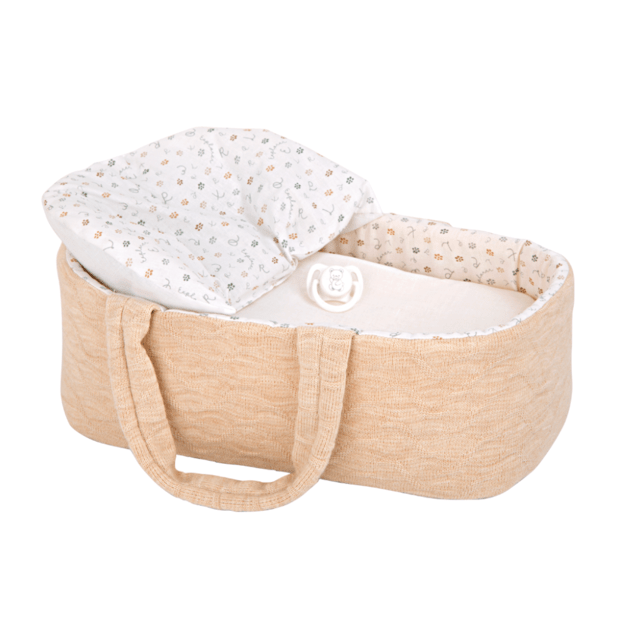 - Lėlytė aprengta mėlynais ir baltais rūbeliais ir paguldyta į smėlinės spalvos nešyklę.
