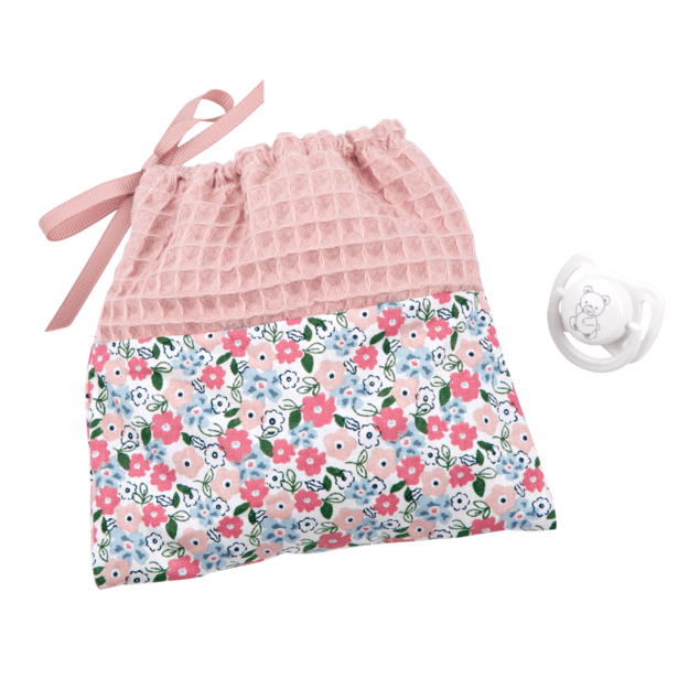 - Rinkinyje yra prie lėlės rūbelių derantis užrišamas medžiaginis maišelis.