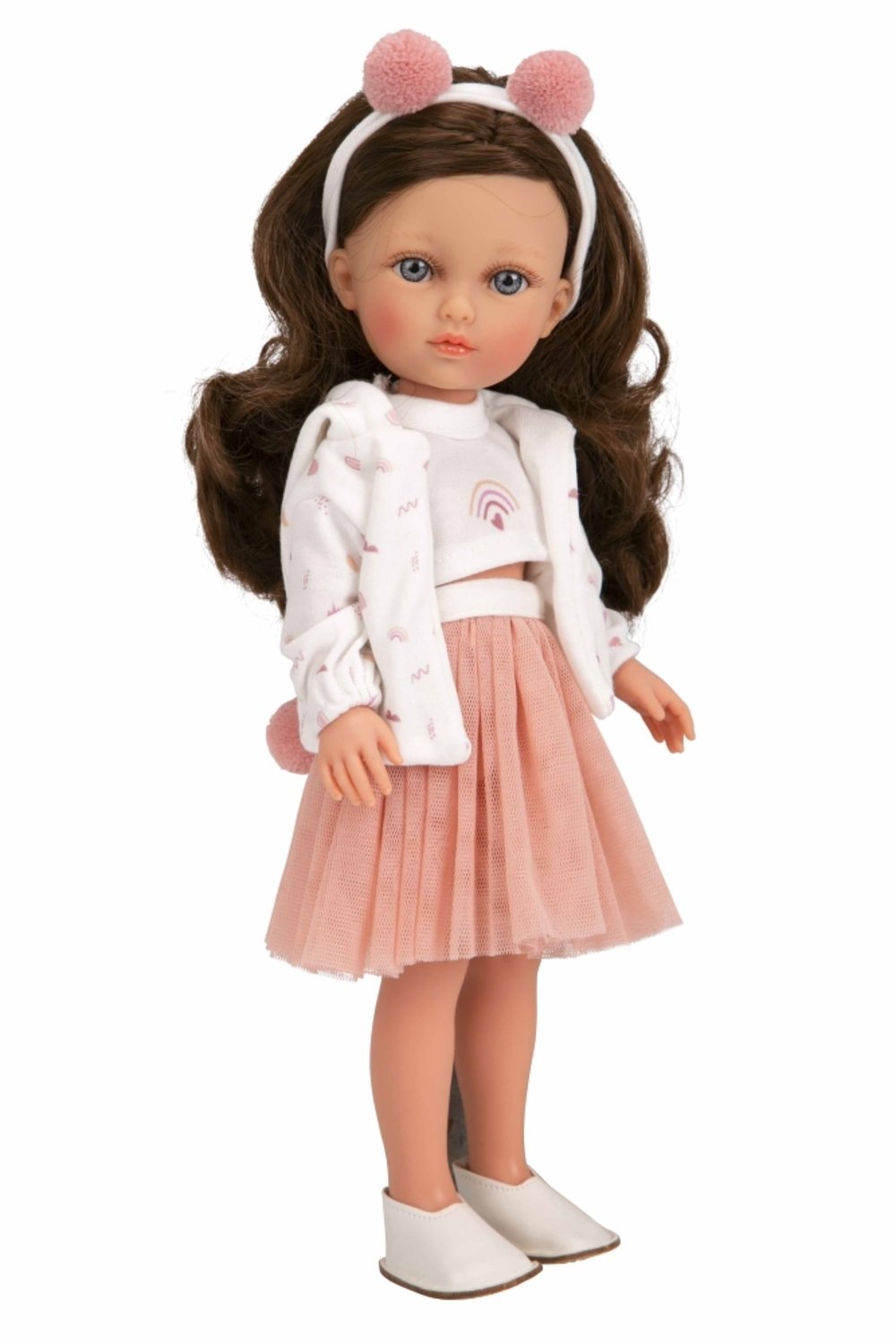 - Lėlytė aprengta stilingais rūbeliais, baltu švarkeliu ir palaidine, rožiniu tiulio sijonu, baltais bateliais ir žaismingu plaukų lankeliu.