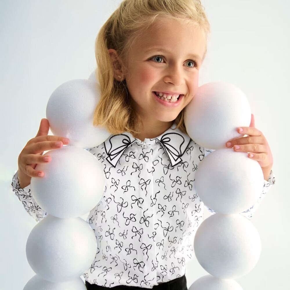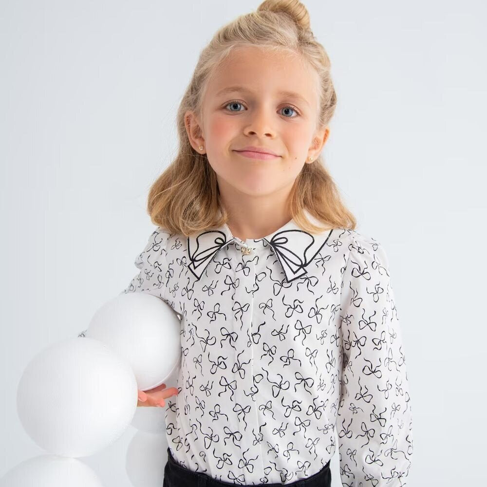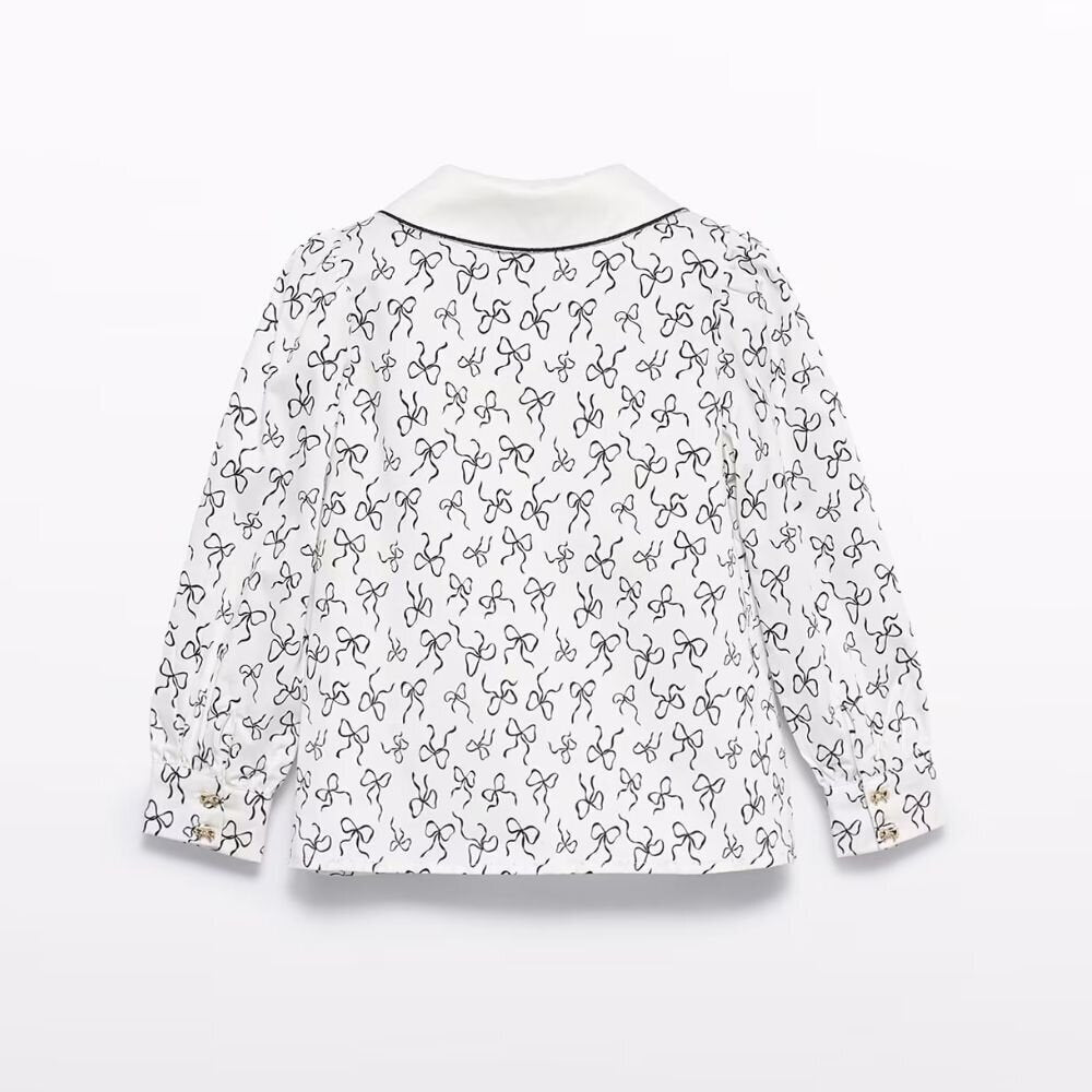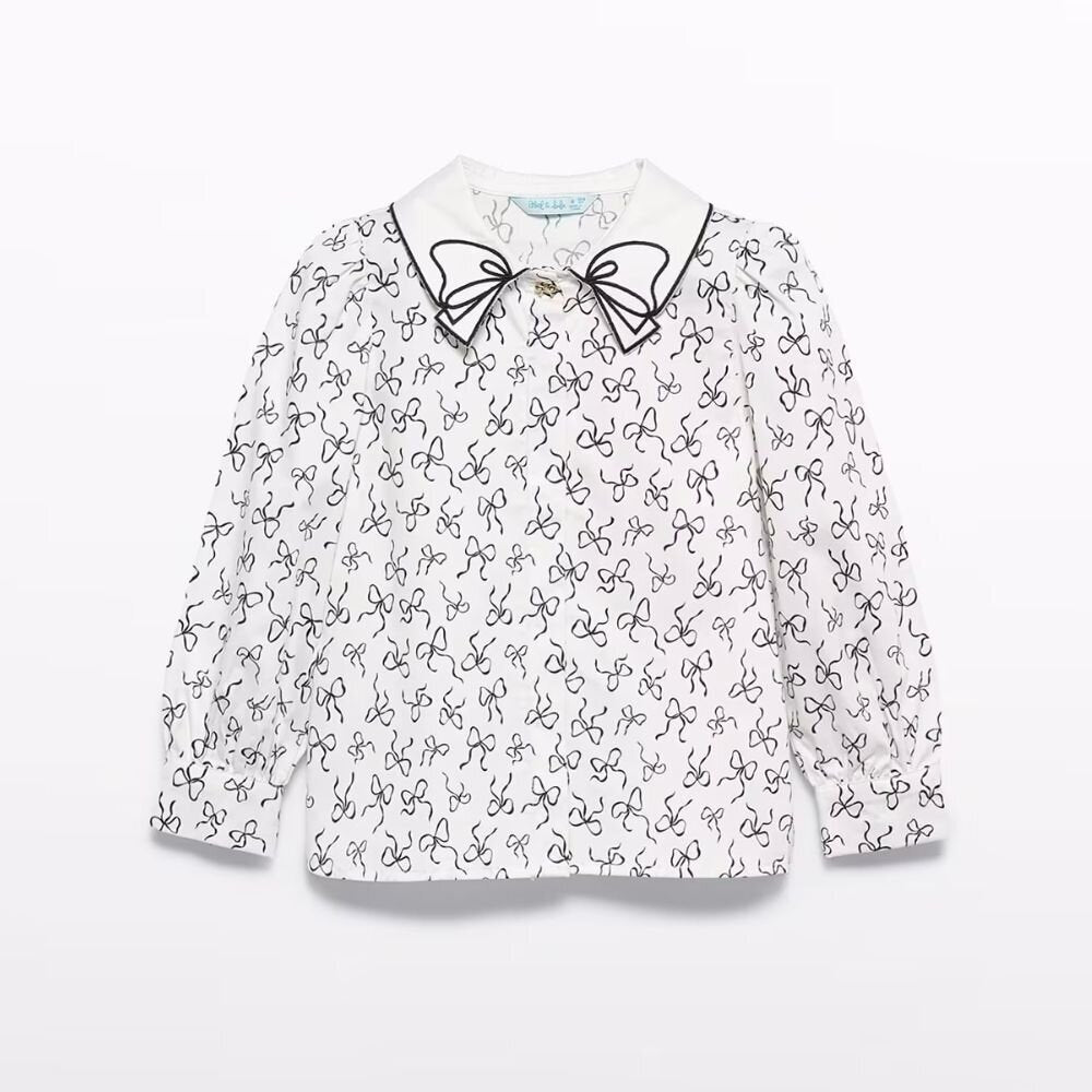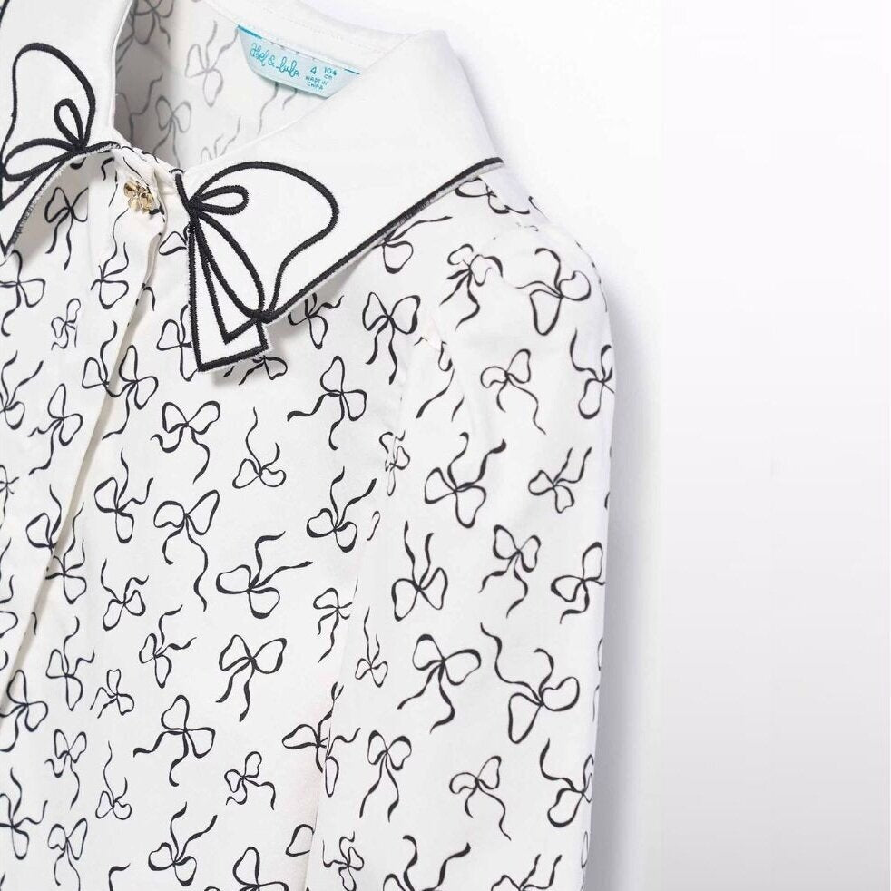 Balta medvilnės palaidinė su bantukais dekoruota apykakle ir mažais juodais kaspinėliais margintu audiniu. Palaidinė pagaminta iš tavrios medvilnės ir priekyje užsegama paslėptomis sagomis. Prabangaus žavesio suteikia kaspinėlių formos sagos ant rankogalių ir apykaklės.