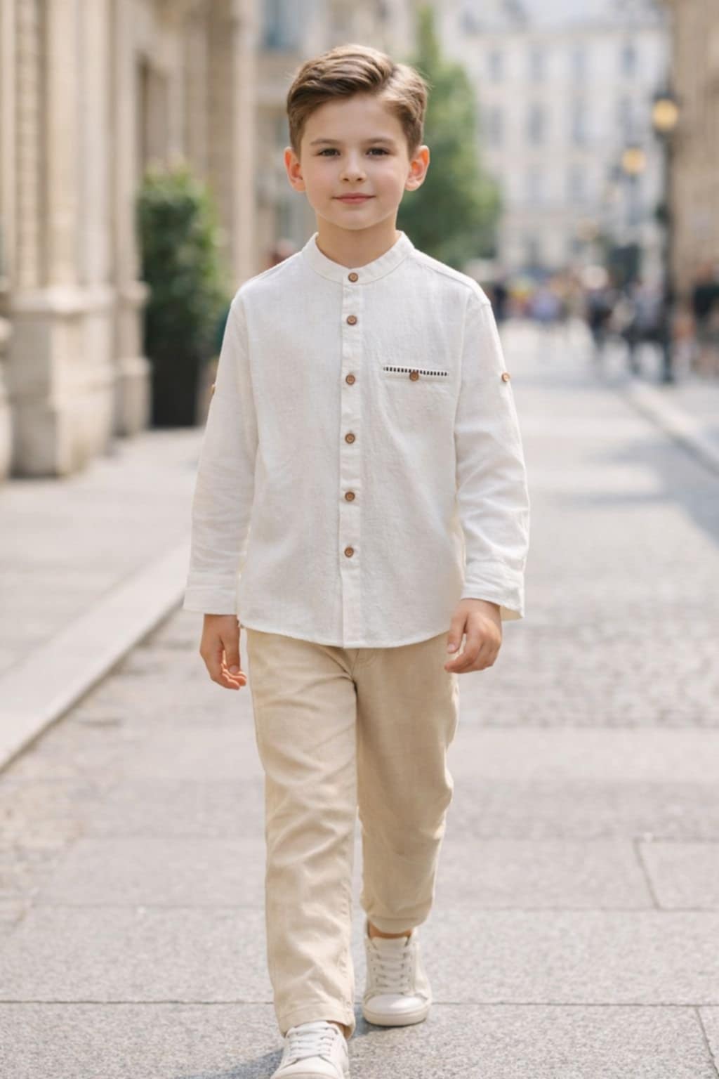 Gražus, laisvalaikio kostiumas berniukui, puikiai tiks bet kokiai progai. Kostiumą sudaro lengvai krentantyys baltinukai, kurių rankovytes galima suseggti ties alkūnėmis sagute ir kelnytės. Kelnių juosmenį galima sureguliuoti su viduj įsiūta guma su sagute.