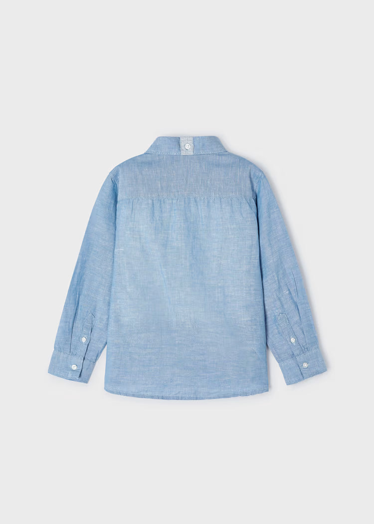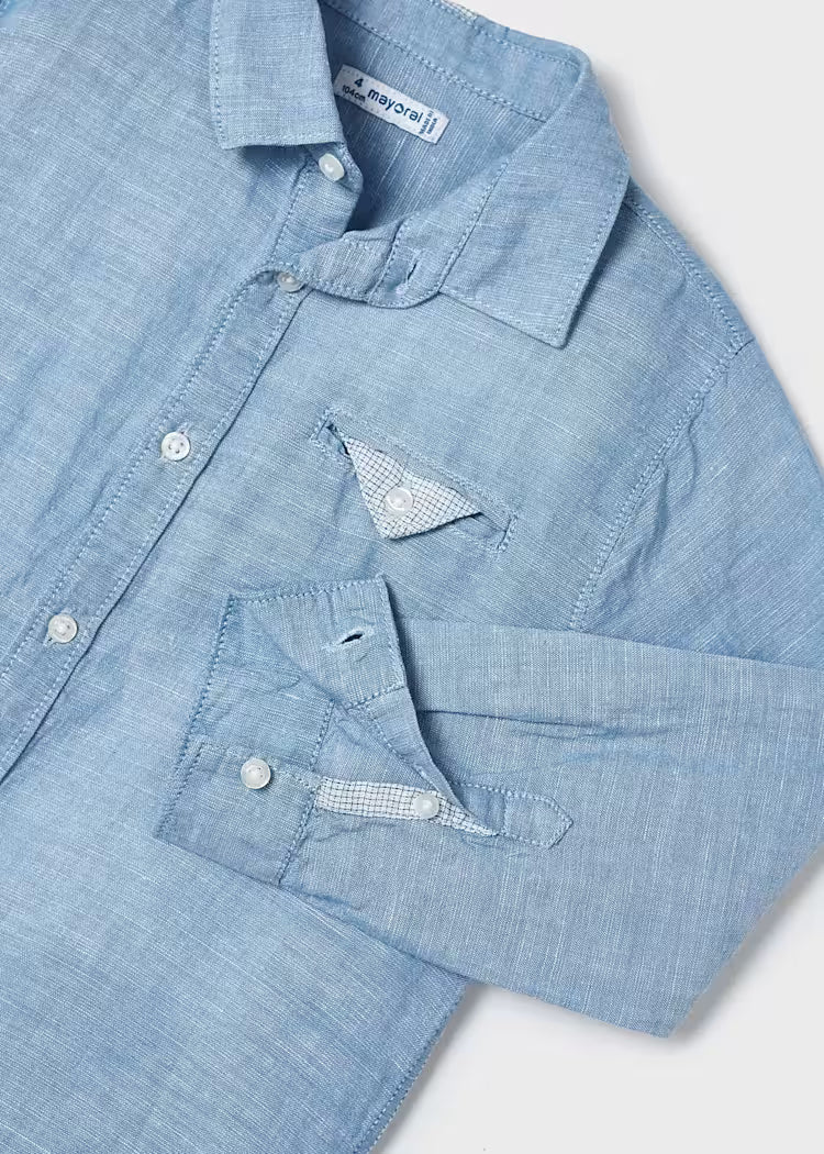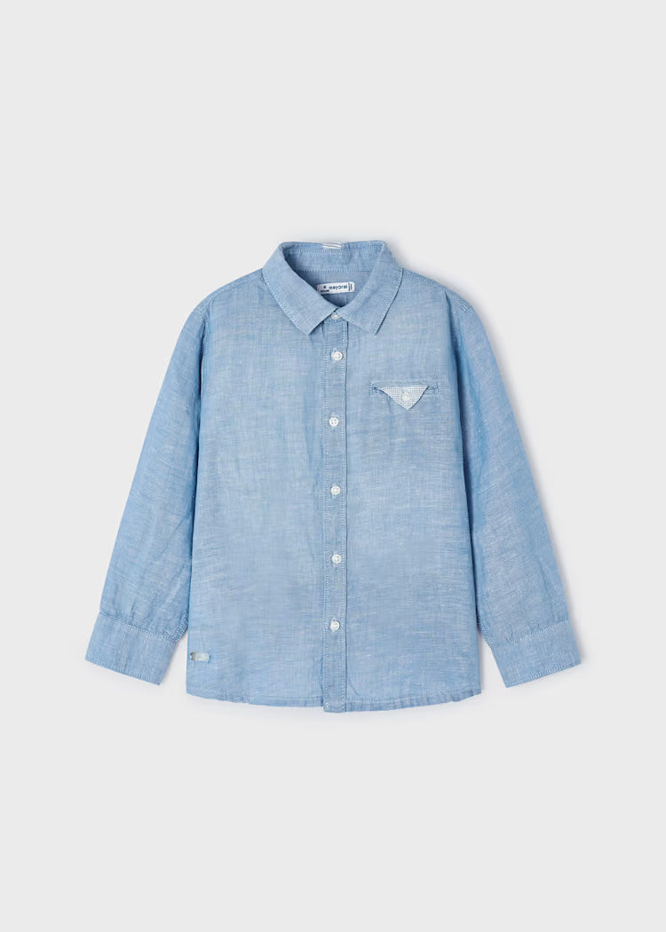 Mayoral puikios sudėties marškinėliai ilgomis rankovėmis berniukams. Puošnumo suteikia dekoruota kišenė. Švelnios žydros spalvos.