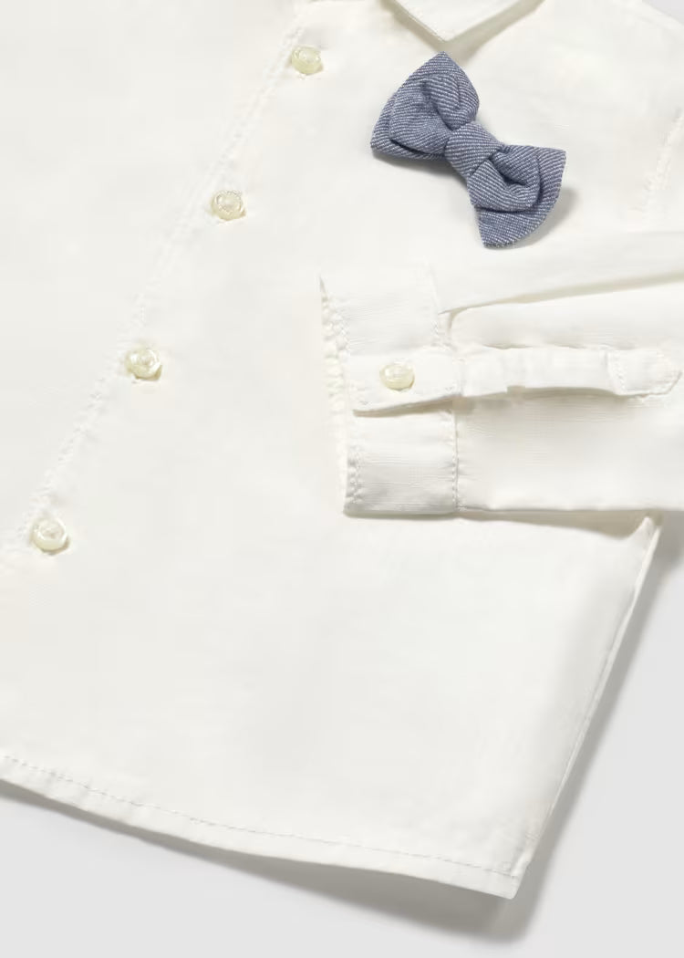 Mayoral klasikinio stiliaus balti marškinėliai berniukams plono medvilninio audiniu. Marškinėliai komplektuojami su varlyte prie kaklo.