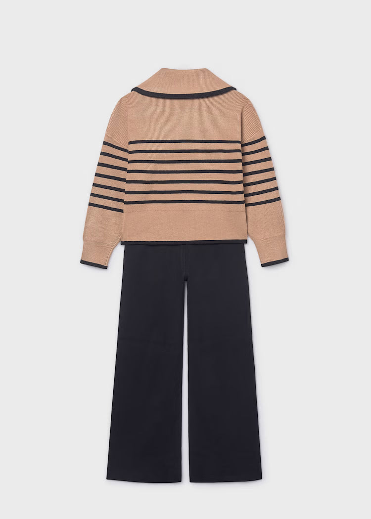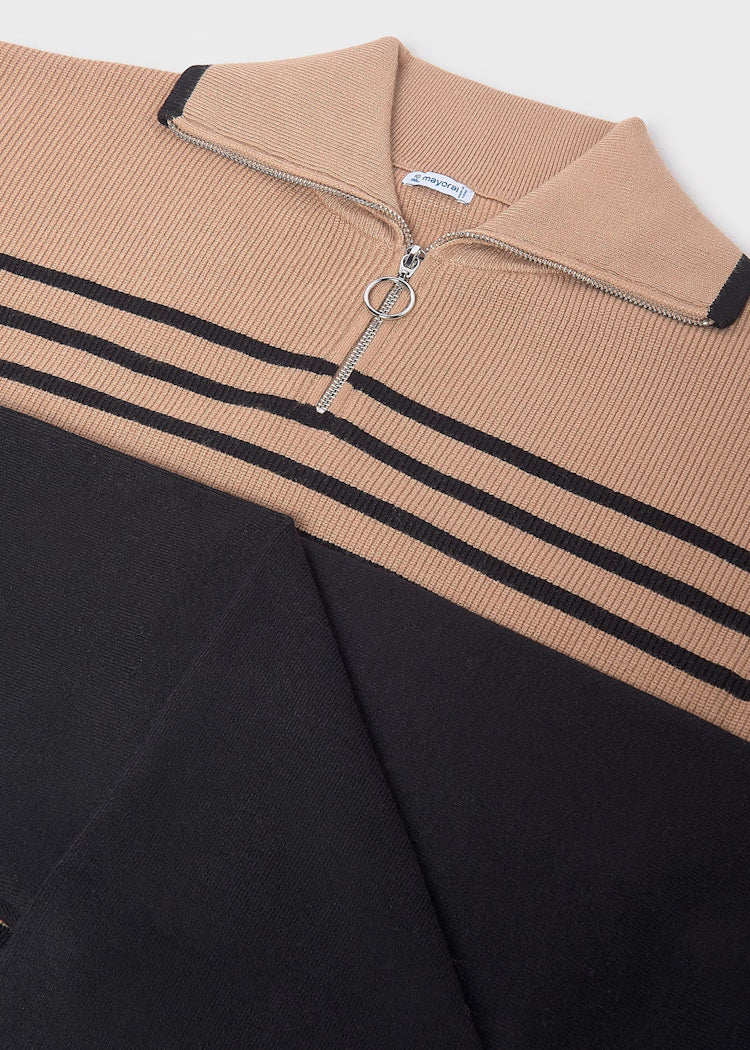 Mayoral tankaus mezgimo, kostiumėlis mergaitėms puikiai tiks laisvalaikiui. Komplektas susideda iš kelnių ir bliuzonėlio su užtrauktuku.