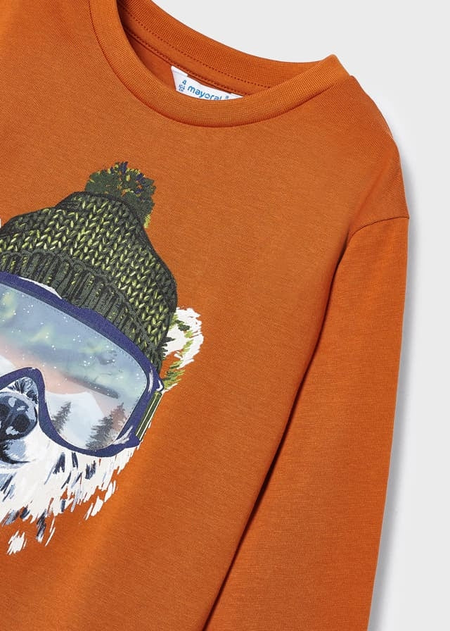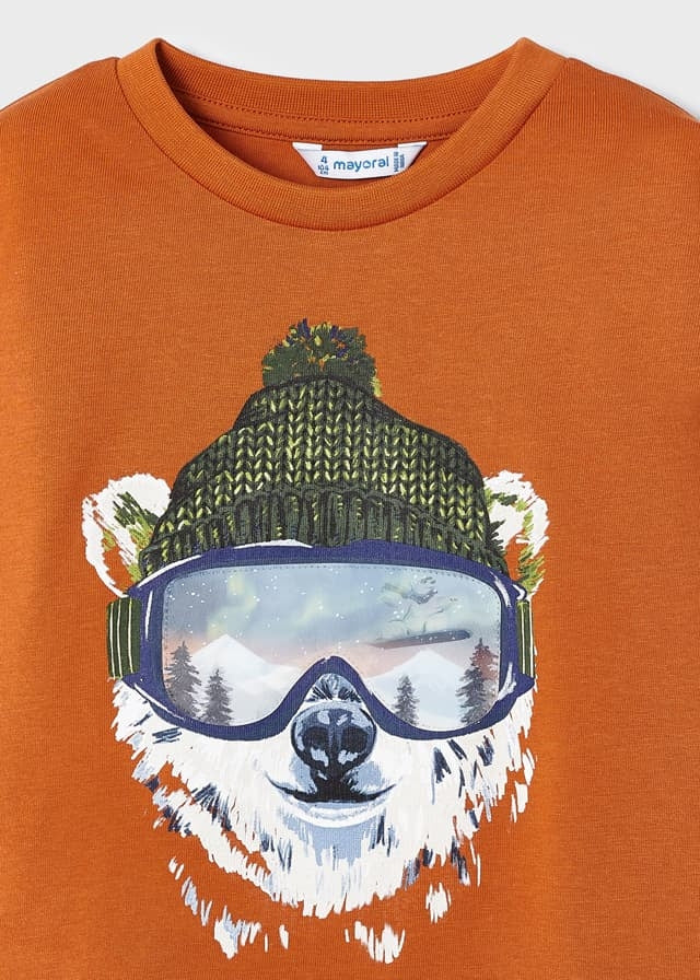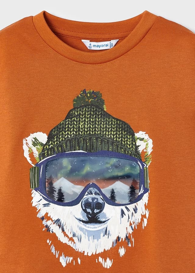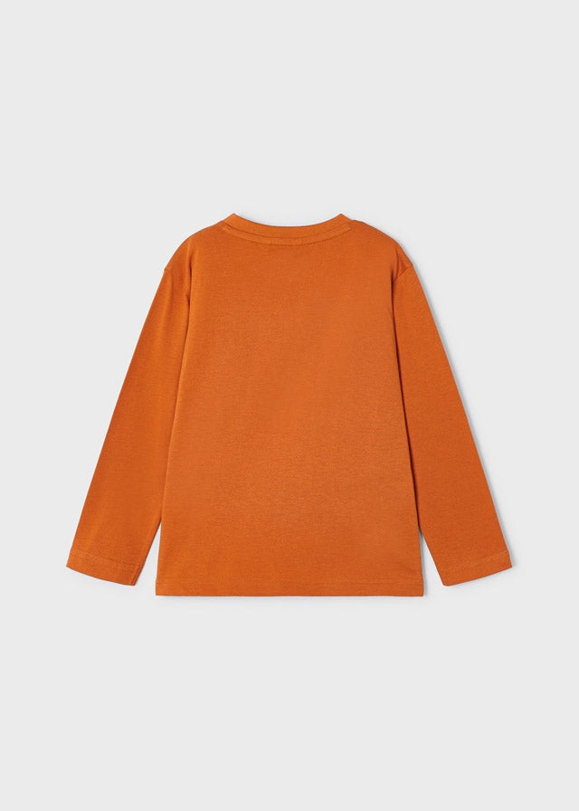 Mayoral marškinėliai berniukams ilgomis rankovėmis. Apvali kaklo linija, malonaus švelnaus audinio. Dekoratyvinė aplikacija keičiasi pakreipus marškinėlius.