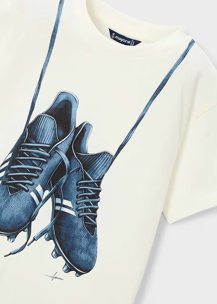 Stilingi balti marškinėliai berniukui su išskirtine futbolo batelių spauda . Pagaminti iš minkšto , malonaus audinio, patogūs dėvėti kasdien ar aktyviam laisvalaikiui. Puikus pasirinkimas mažajam futbolo mylėtojui.