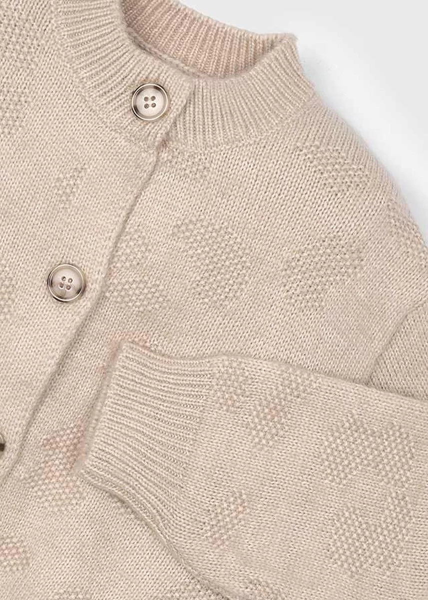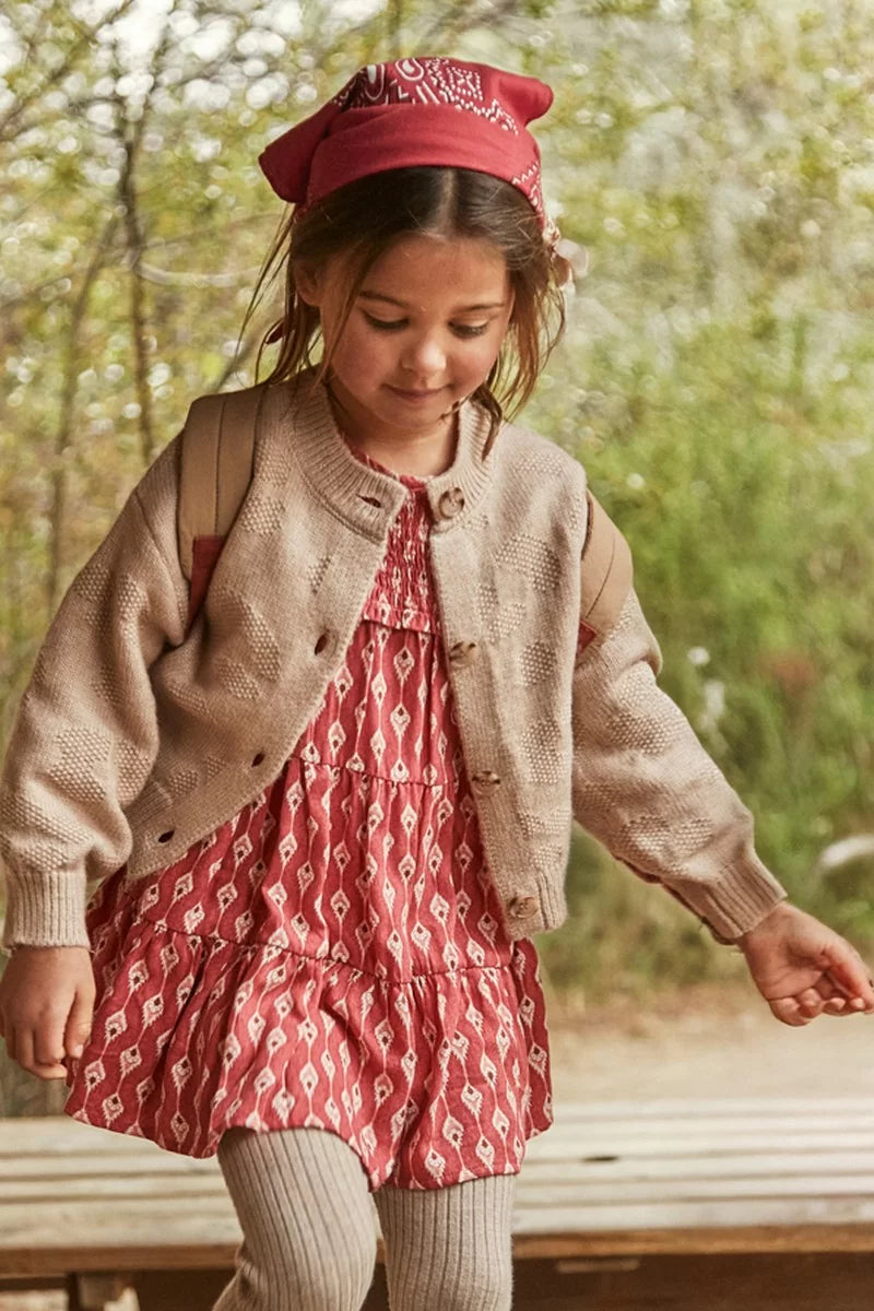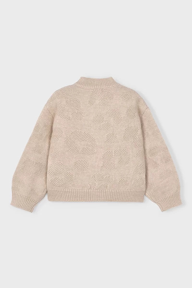 Rusvos spalvos megztinis mergaitei. Minkštas ir jaukus mezgimas puikiai tiks pasipuošti bet kuriuo metų laiku. Puošnumo dar suteikia subtilus mezginio raštas.