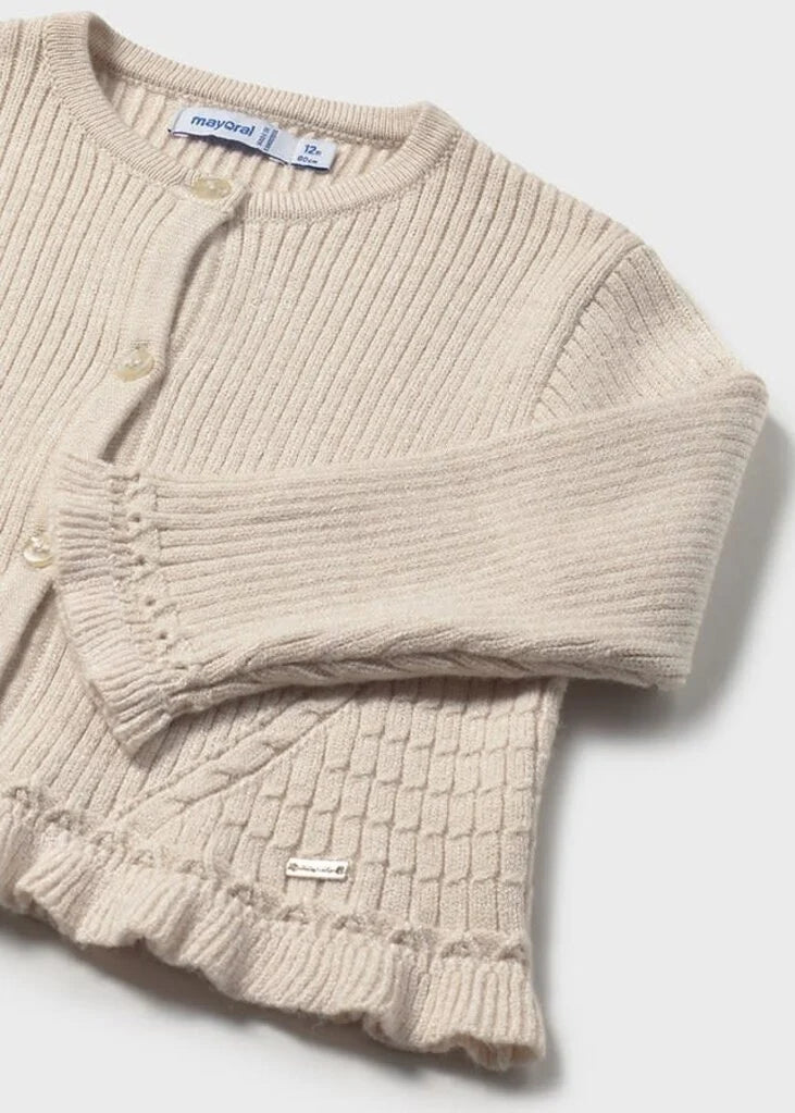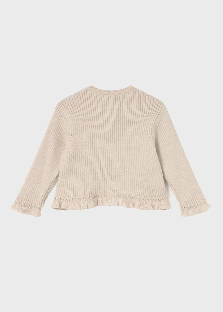 Šampaninės spalvos megztinis mergaitei. Minkštas ir jaukus mezgimas puikiai tiks pasipuošti bet kuriuo metų laiku. Puošnumo suteikia gražiu raštu puoštos rankovytės ir apačia. Puošnumo dar suteikia subtilus mezginio raštas šonuose.