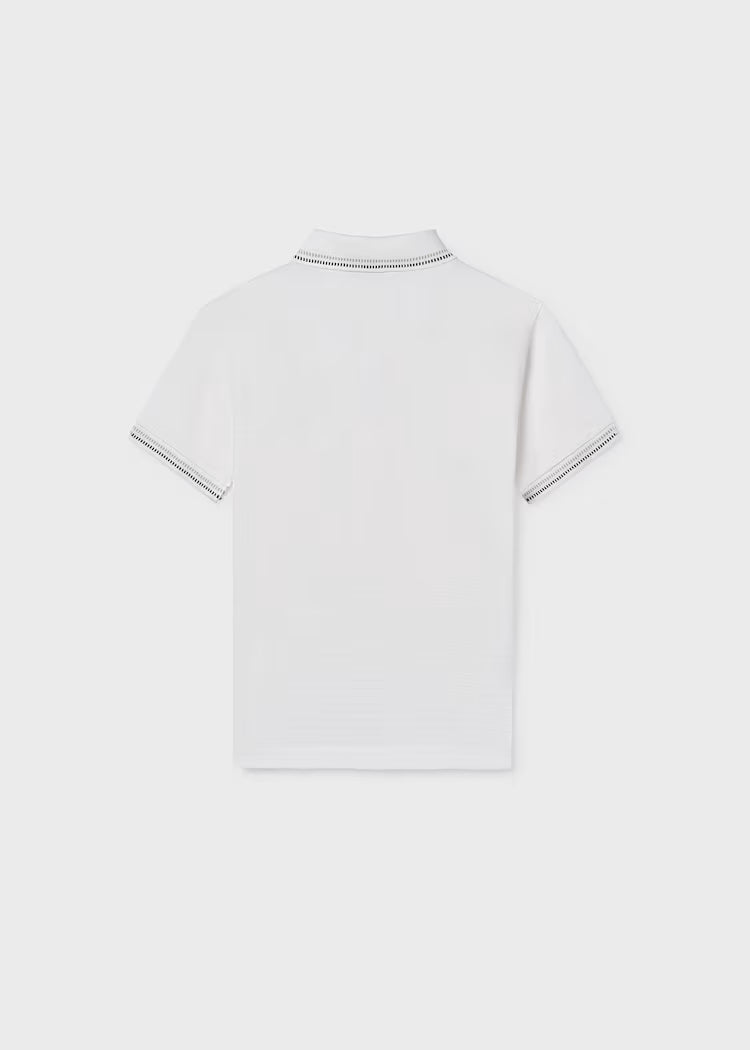 Mayoral puošnaus audinio su stilingu kalnieriuku polo marškinėliai trumpomis rankovėmis. Pieno baltumo spalvos. Puikiai tiks bet kuriai progai.