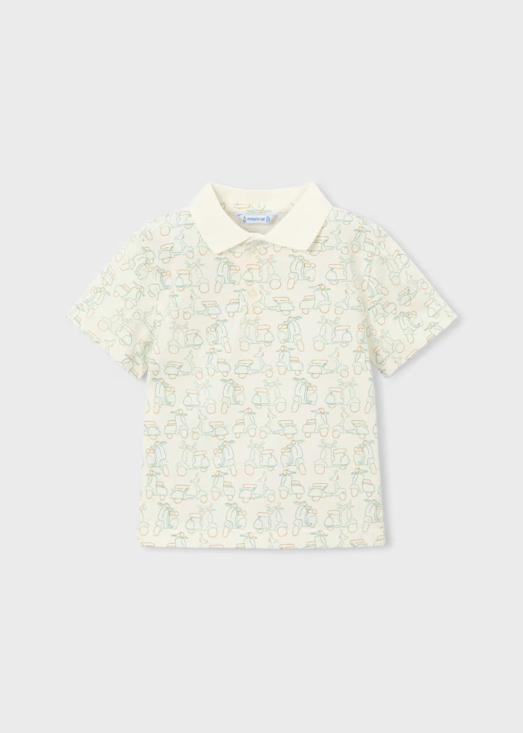 Baltos spalvos vaikiški polo marškinėliai su apykakle, dekoruoti subtiliu pastelinių spalvų motorolerių raštu. Pagaminti iš švelnios „Better Cotton“ medvilnės, su sagutėmis priekyje. Stilingas ir patogus pasirinkimas vasaros sezonui.