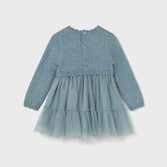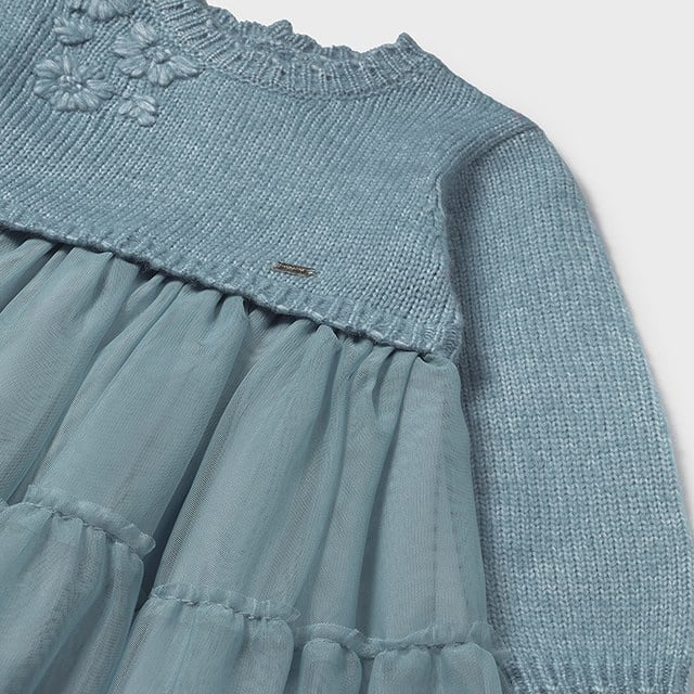Puošni, elegantiška Mayoral suknelė mergaitėms. Apvali kaklo linija. Suknelės sijonas su rauktu tiuliu, dviejų sluoksnių. Suknelės viršus puoštas siuvinėtomis gėlėmis. Gražų kritimą palaiko esantis pamušalas.
