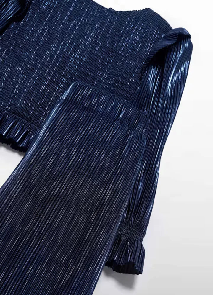 Dviejų dalių komplektas pagamintas iš lengvo gražiai krentančio audinio. ilgos ties riešu gražiai rauktos rankovtės, palaidinė priekyje turi subtilią raukinių detalę ir užsegama sagutėmis nugaroje. Plačios klostuotos kelnės turi elastingą ir patogų juosmenį. Komplekto viršutinė ir apatinė dalis išklota minkštu ir lengvu pamušalu.