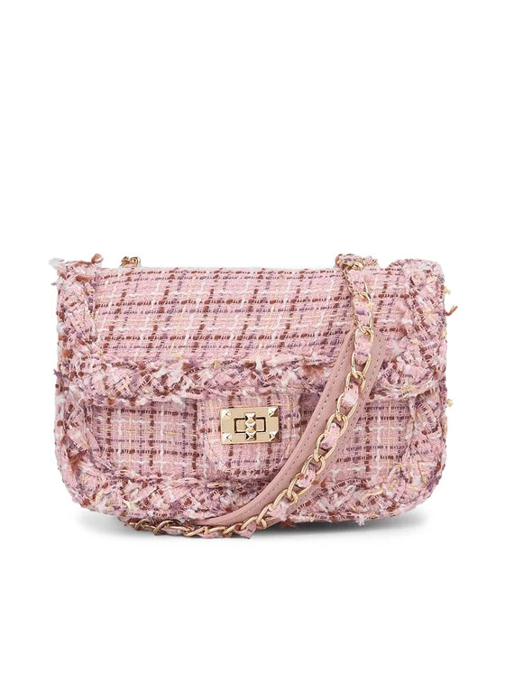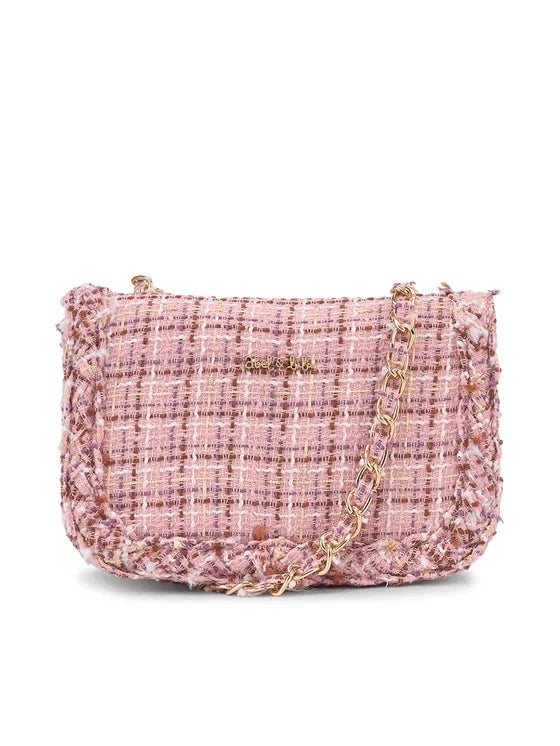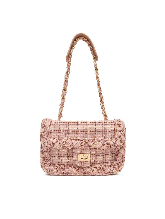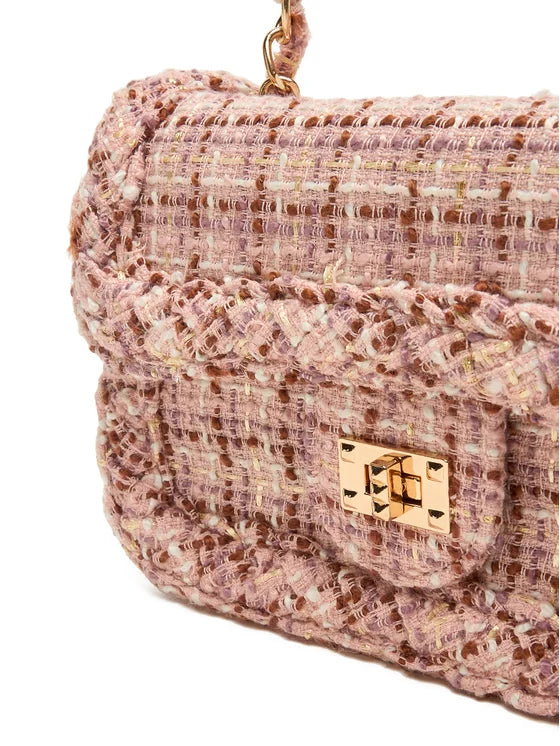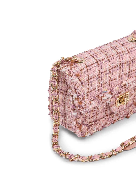 Mergaitiška rankinė, pasiūta iš rožinio tvido audinio su auksiniais blizgučiais. Rankinė turi pečių dirželį - grandinėlę, pintą su tvido audiniu. Erdvus skyrius užsegamas aukso spalvos pasukamu užsegimu. Viduje nedidelė kišenėlė.