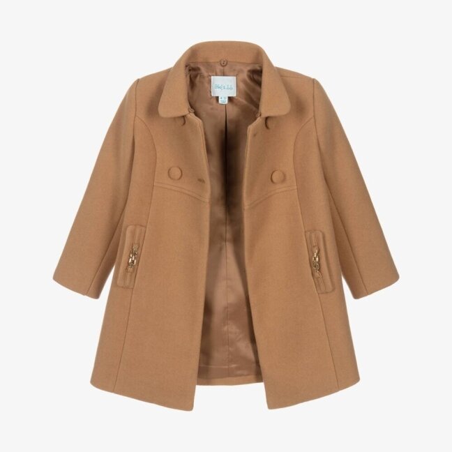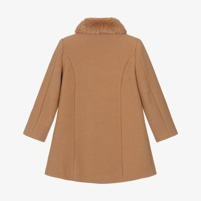 Rudos spalvos rudeninis paltas mergaitėms, pasiūtas iš minkštos audinio su nuimama dirbtinio švelnaus kailio apykakle. Atlasinis pamušalas suteikia prabangos pojūtį. Priekinės kišenės turi dailią apdailą.