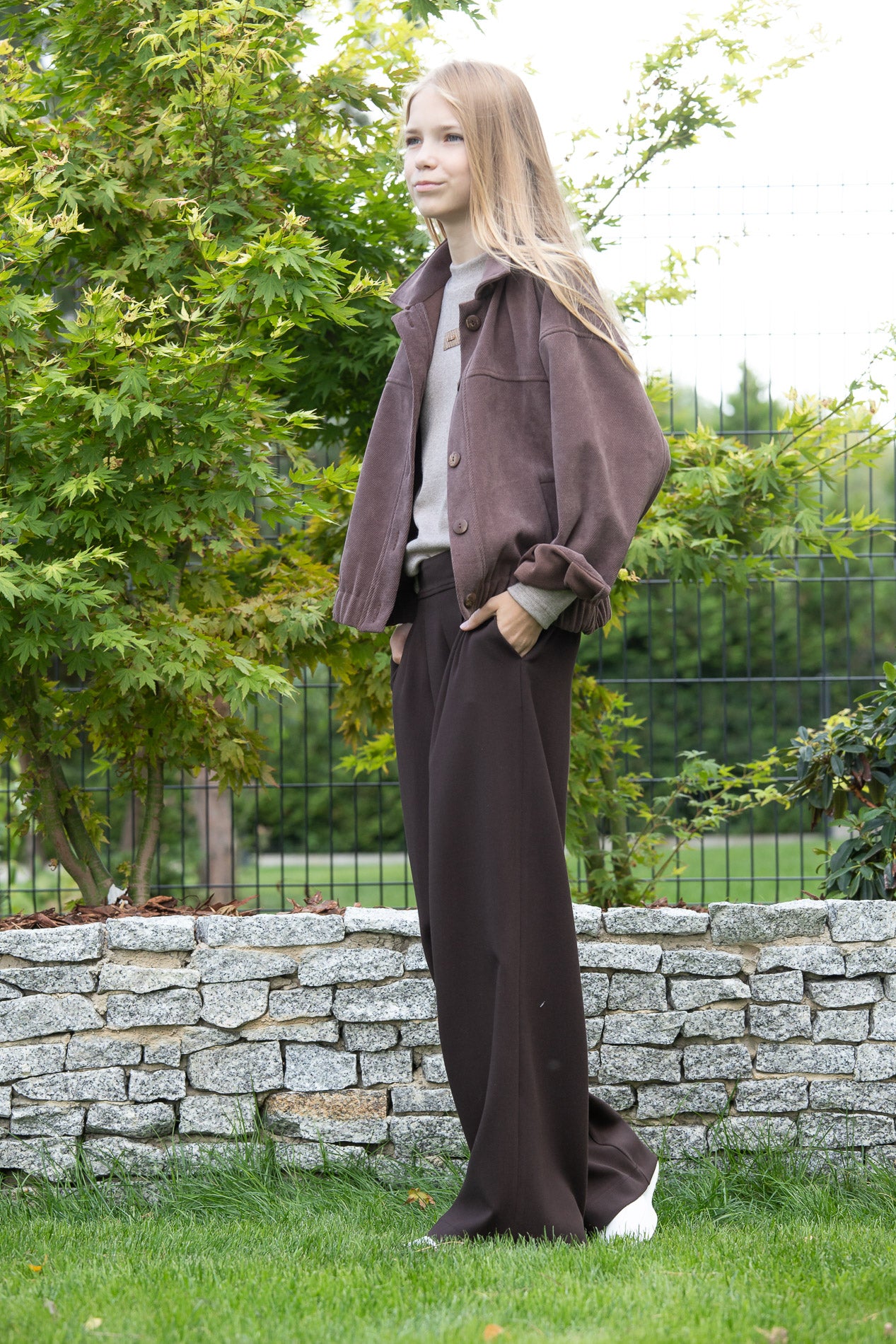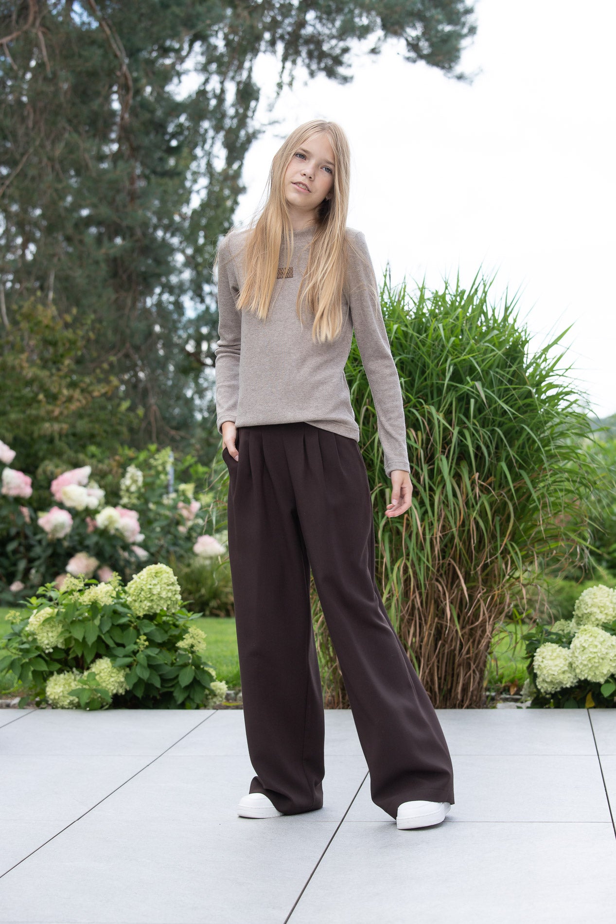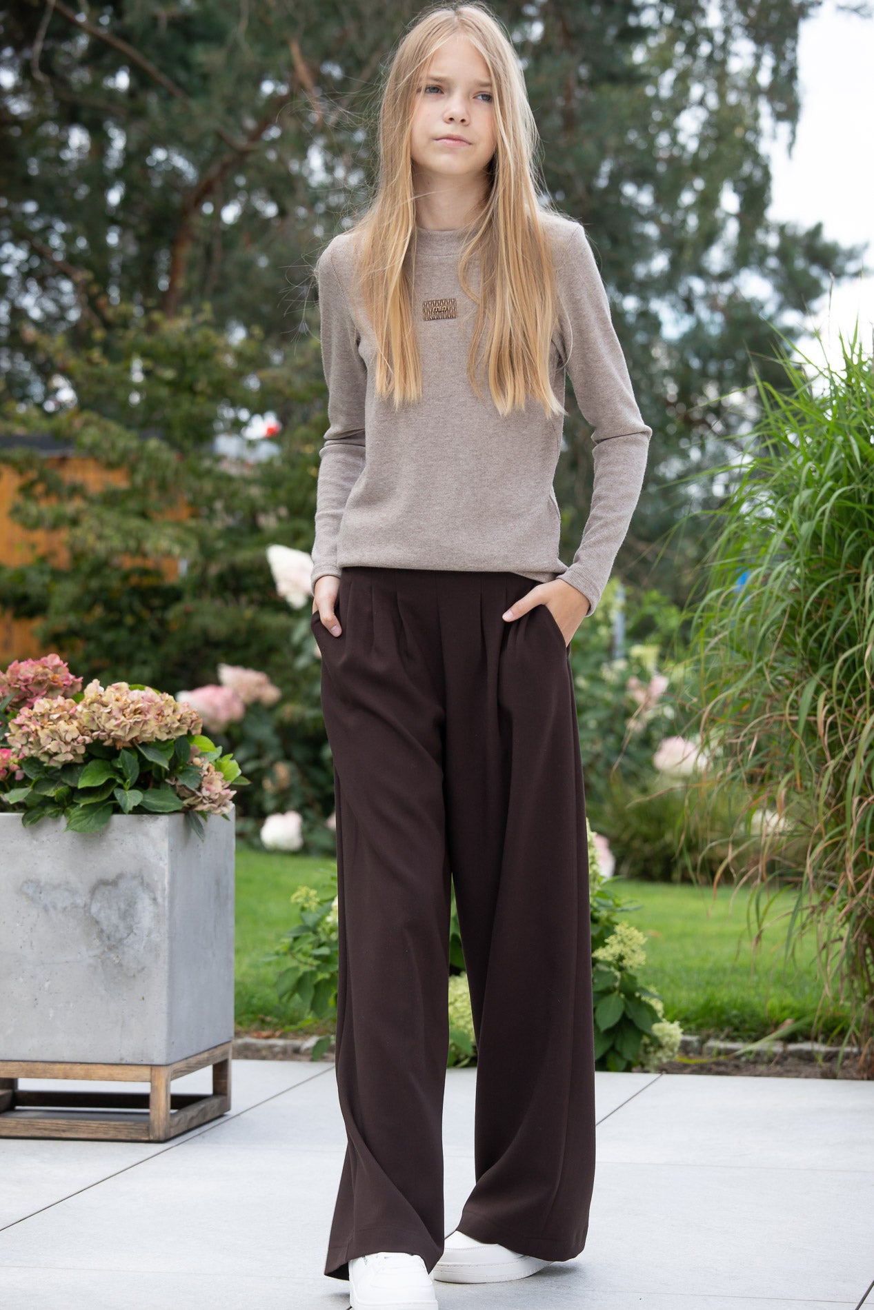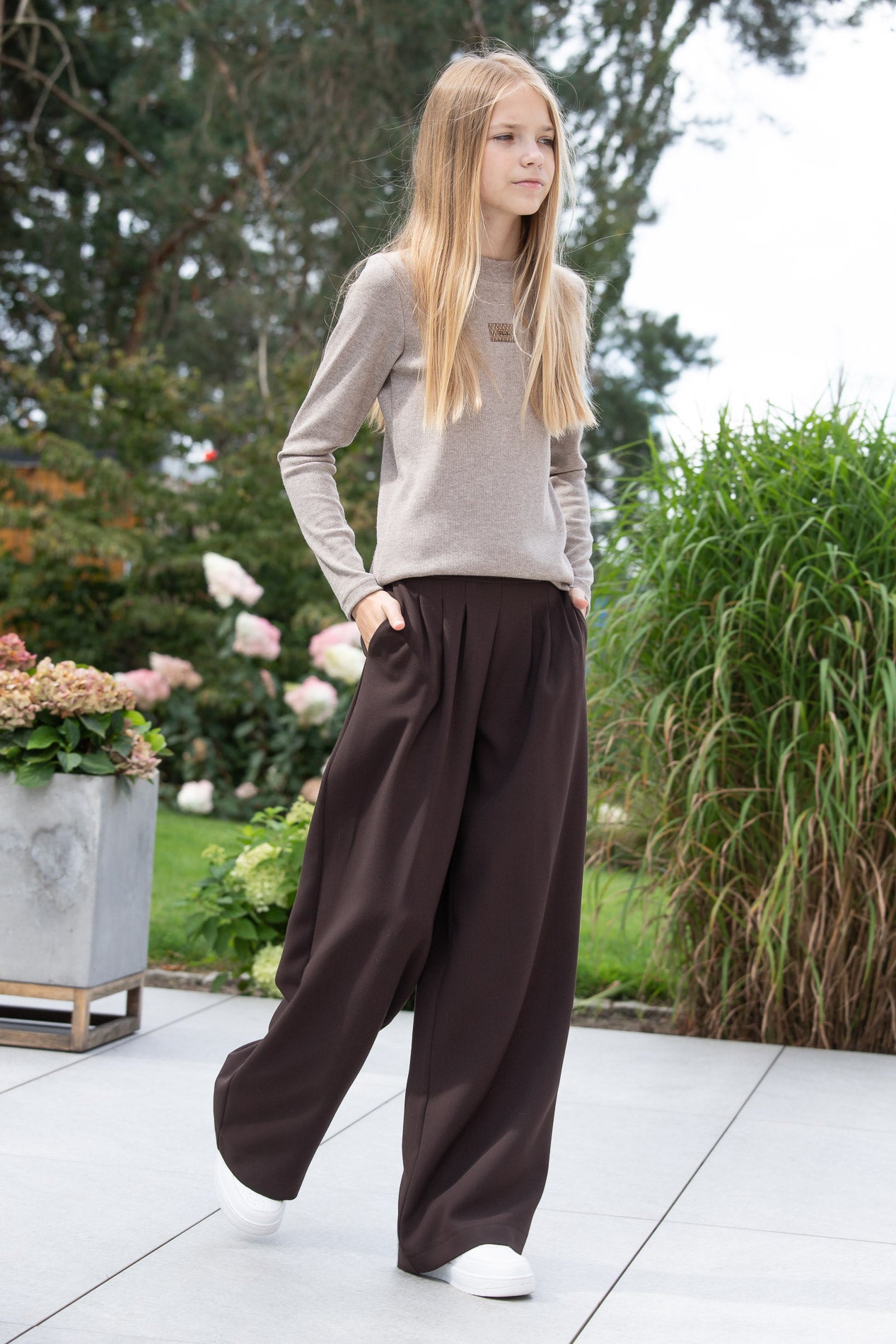 Gražios rudai šokoladinės spalvos, gražiai krentančios kelnės, puikus pasirinkimas rudenį. Kelnės nugaroje rauktos su guma, patogumo suteikia esančios kišenės.