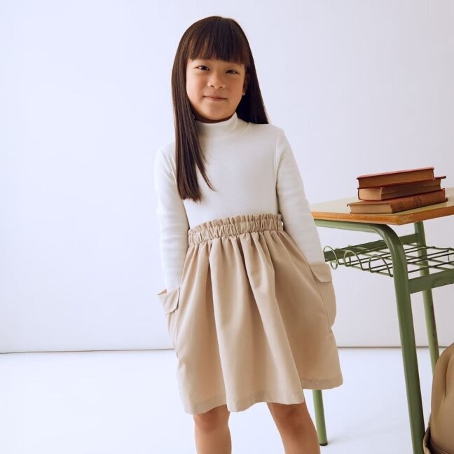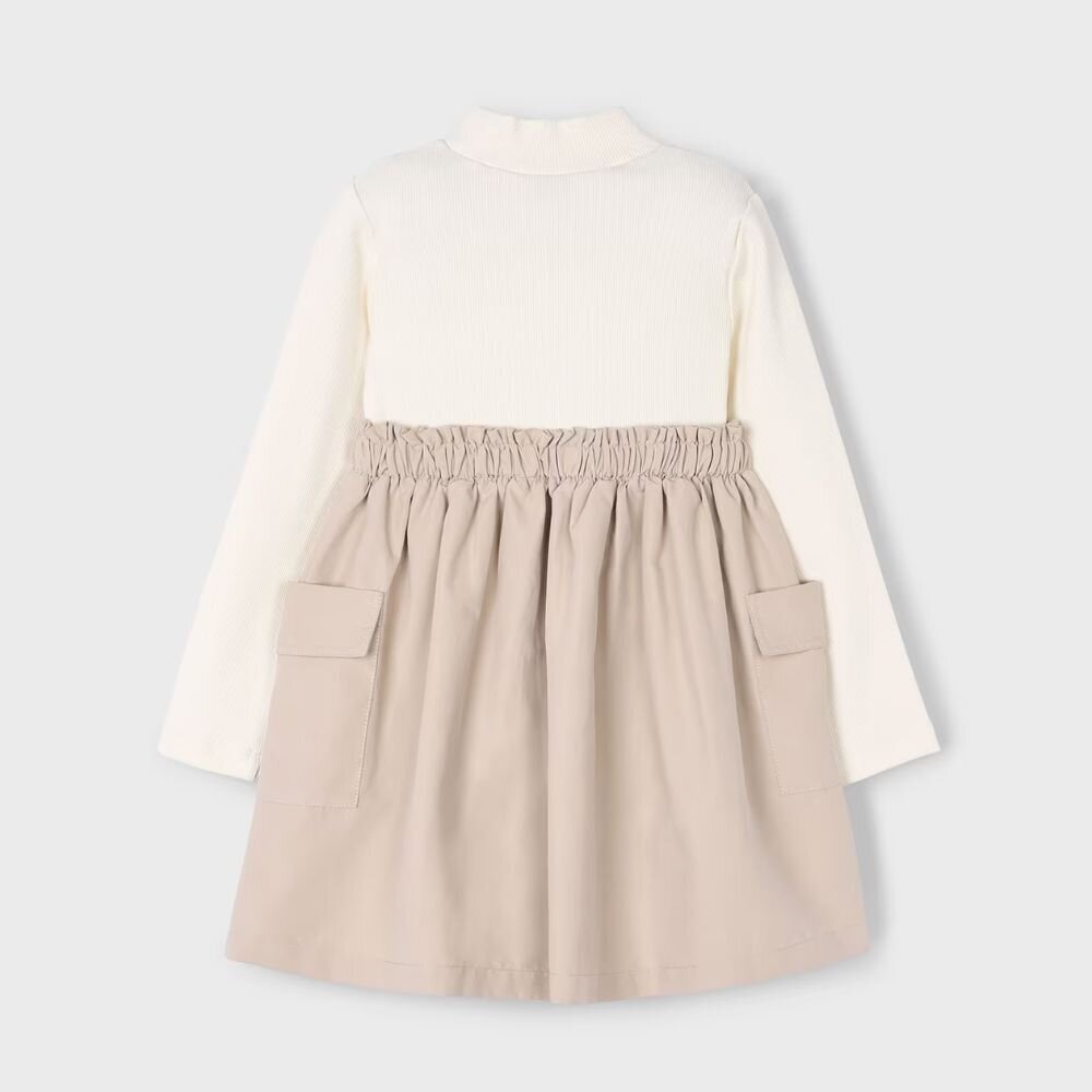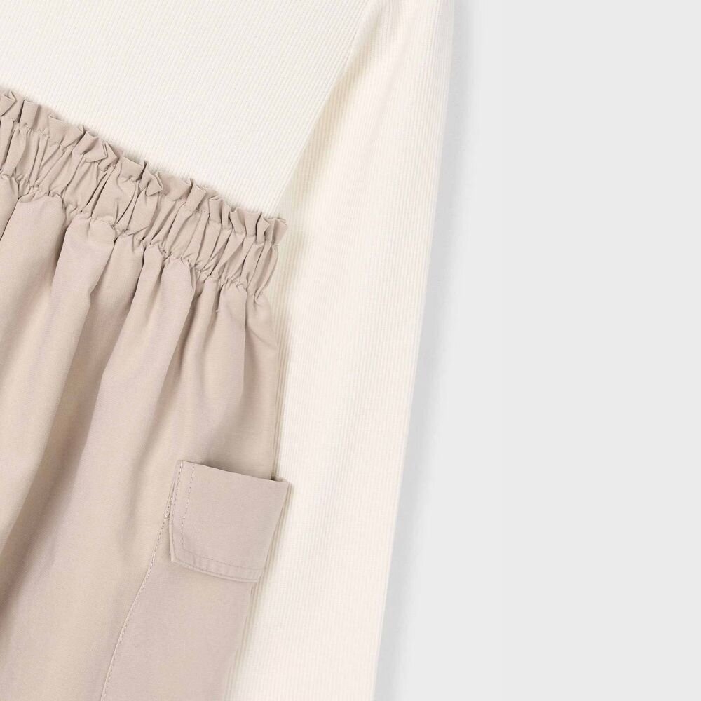 Patogi kasdieninė kontrastinių spalvų suknelė mergaitėms. Pasiūta iš dramblio kaulo spalvos minkšto džersio ir smėlio spalvos šilkinio švelnumo audinio. Suknelė turi patogias ilgas rankoves ir elastingą juosmenį. Suknelės viršus gerai tempiasi, patogu apsivilkti. Suknelė neturi jokių užsegimų. Sijono dalyje praktiškos kišenės.