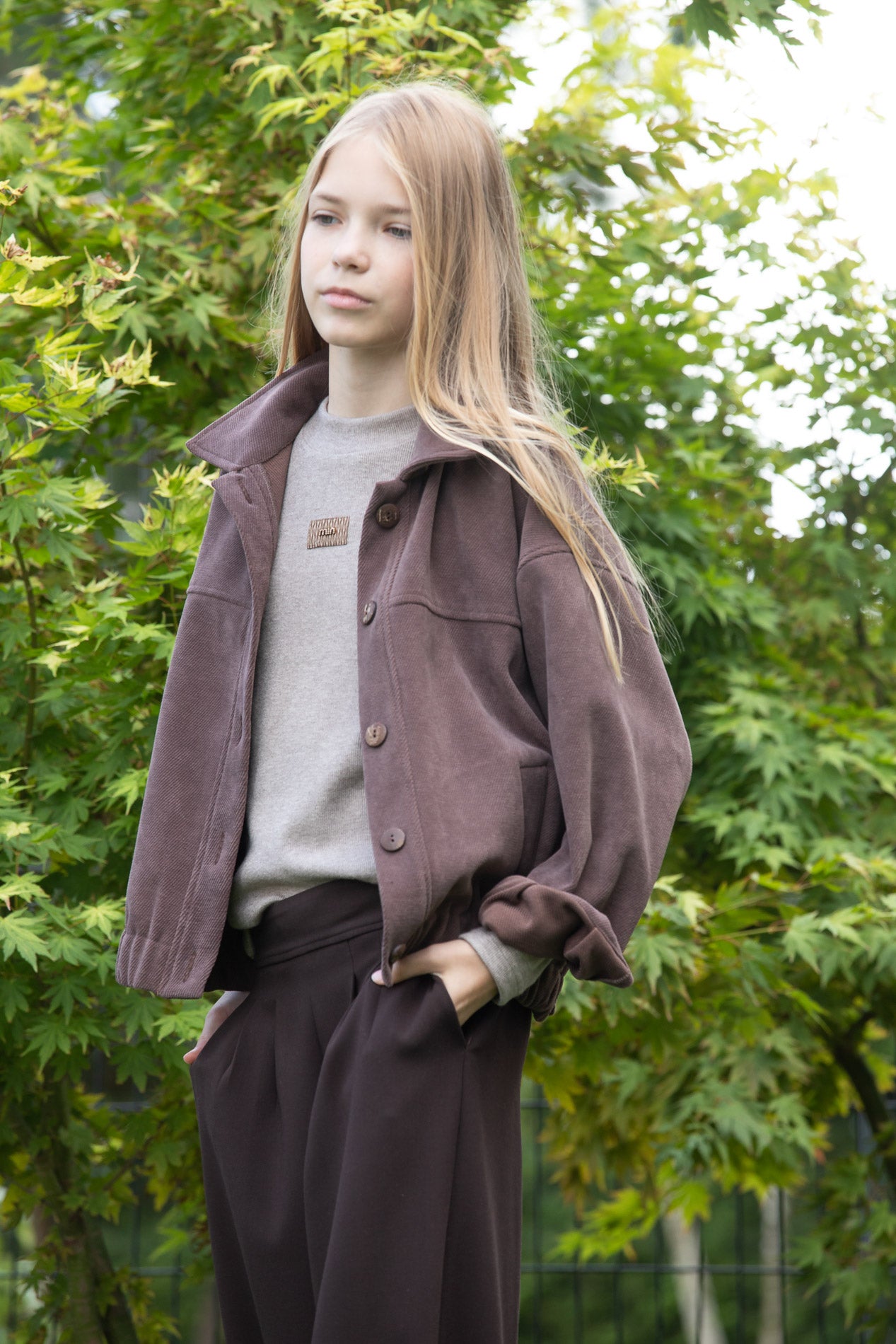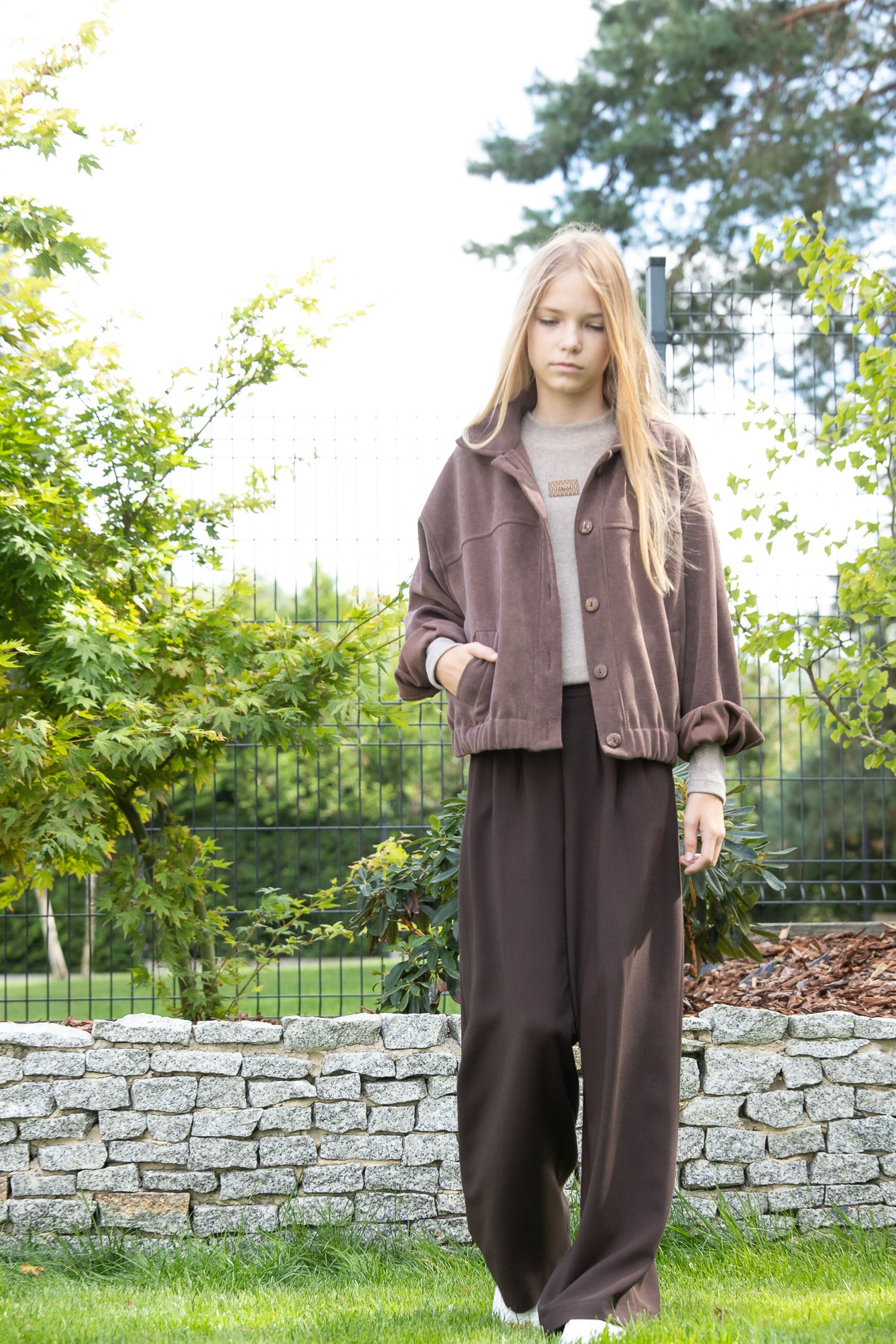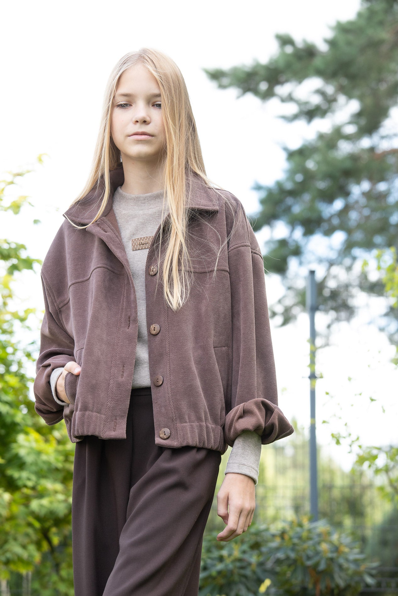 Gražus, malonaus, minkšto audinio švarkelis puikus pasirinkimas rudeniui. Patogumo suteikia esančios kišenės. Gražios rudos spalvos.